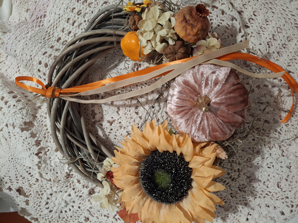 Vessző alapra készült őszi kopogtató,golden rose színű bársonytökkel,szárított növényekkel 22 cm az alap átmérője
