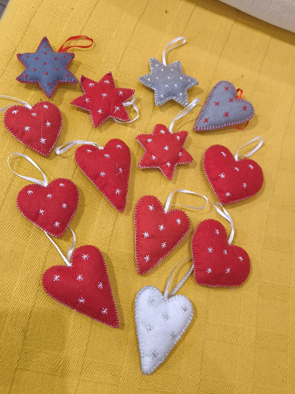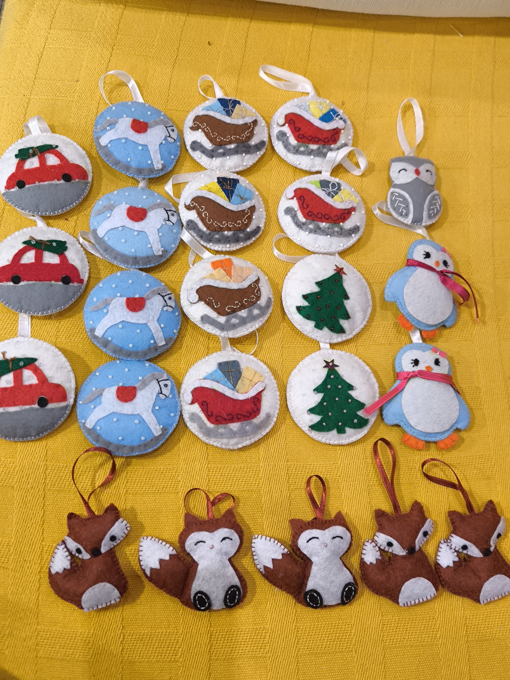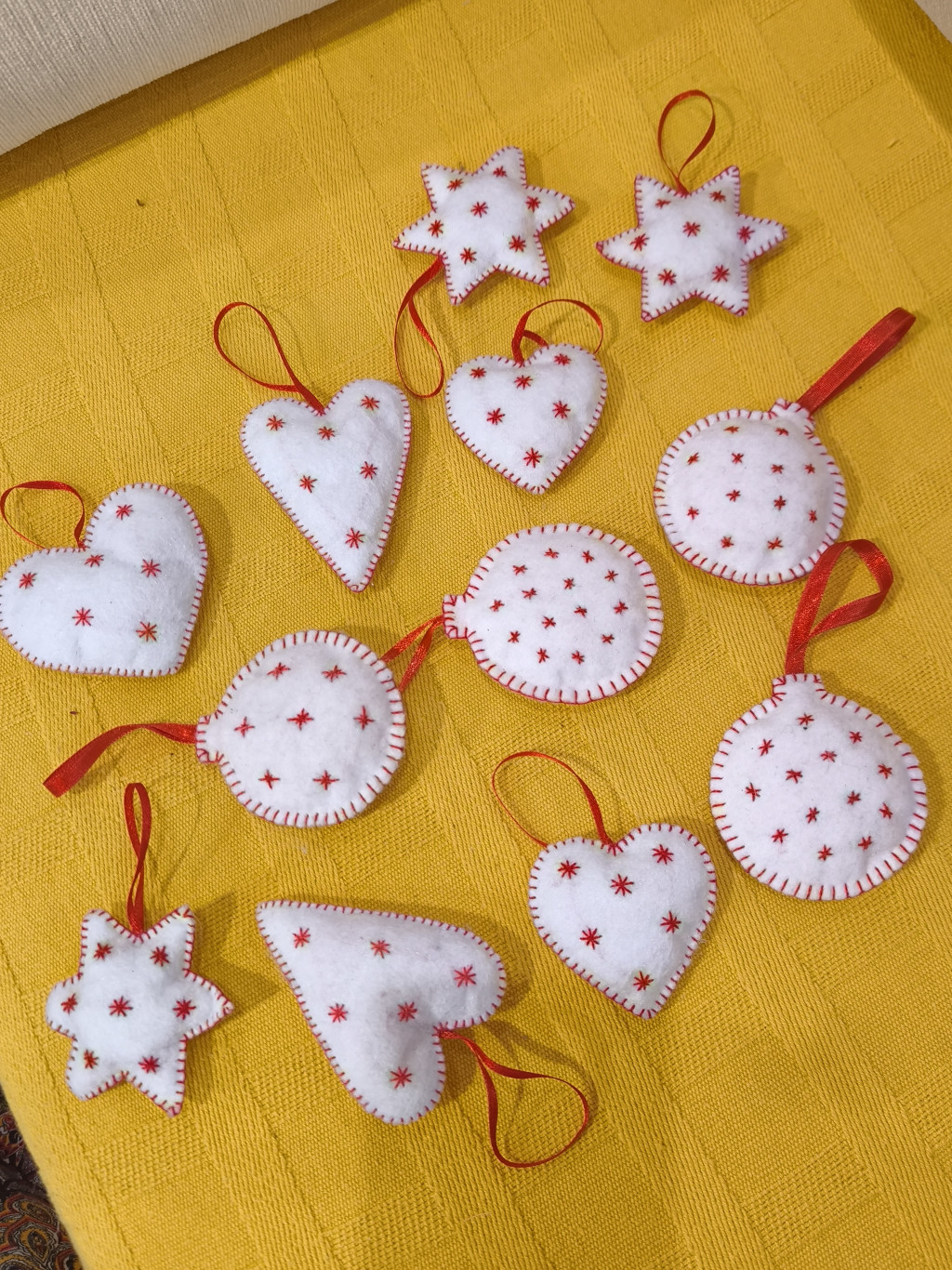 Filc anyagból készült,vatelin töltettel. Aprólékos, kézzel varrt,hímzett. A csomag tartalma a 12 db dísz.