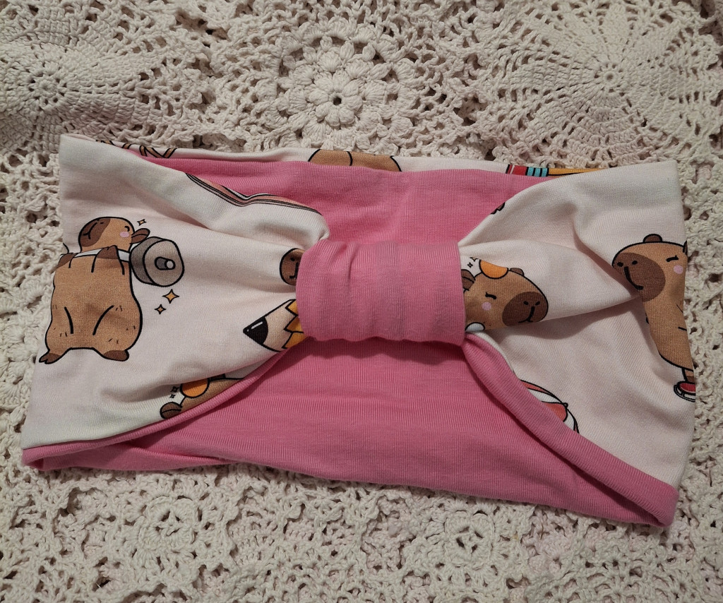 Cuki capibarás mintás,mindkét oldalán viselhető fülvédő,puha pamut jersey anyagból 48 cm-es fejkörfogatra,az anyag rugalmas