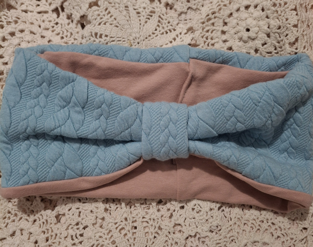 Mindkét oldalán viselhető,kék kötött hatású és púder színű fülvédő 52 cm-es fejkörfogatra ajánlom,az anyag rugalmas
