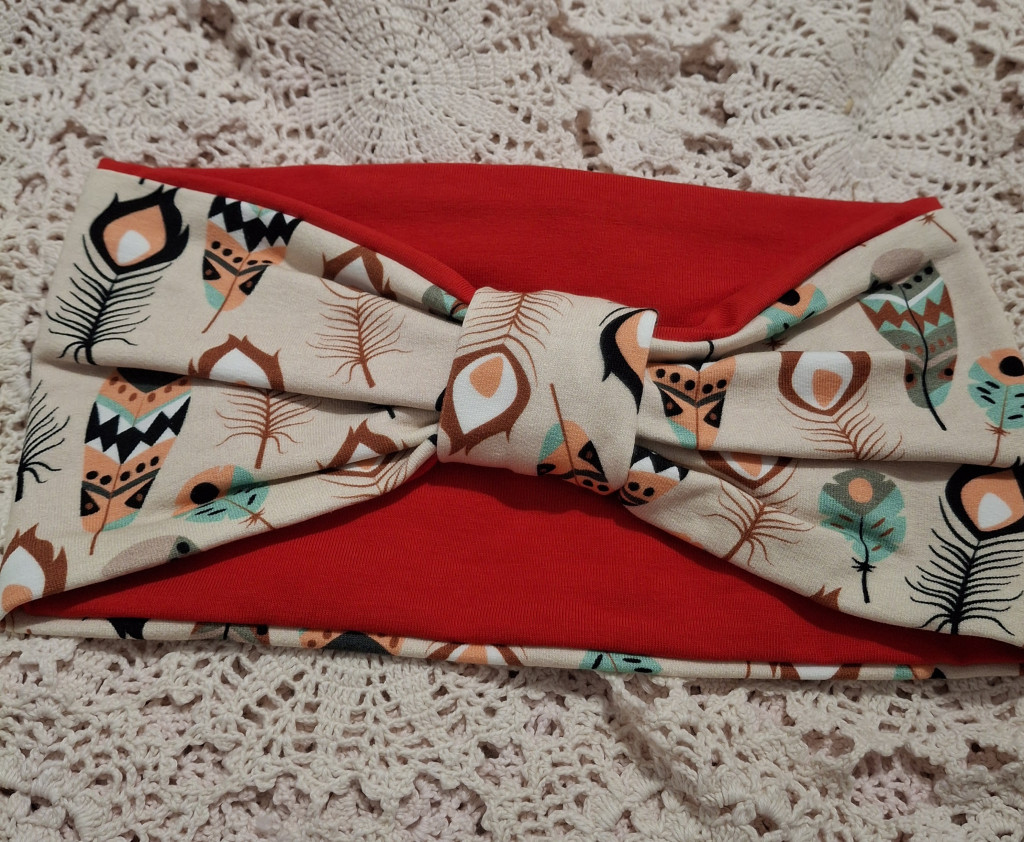 Mindkét oldalán viselhető toll motívumos fülvédő,designer futterből 50 cm-es fejkörfogatra,az anyag rugalmas