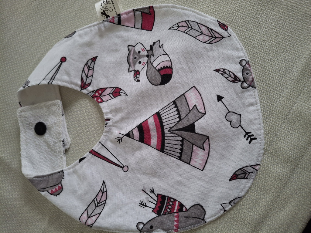 Baba nyálkendő Bájos rózsaszín pöttyös mintával és vízzáró hátoldallal készült,patenttal záródik. Viselése közben nem ázik át a baba ruhája,elég csak nyálkendőt cserélni