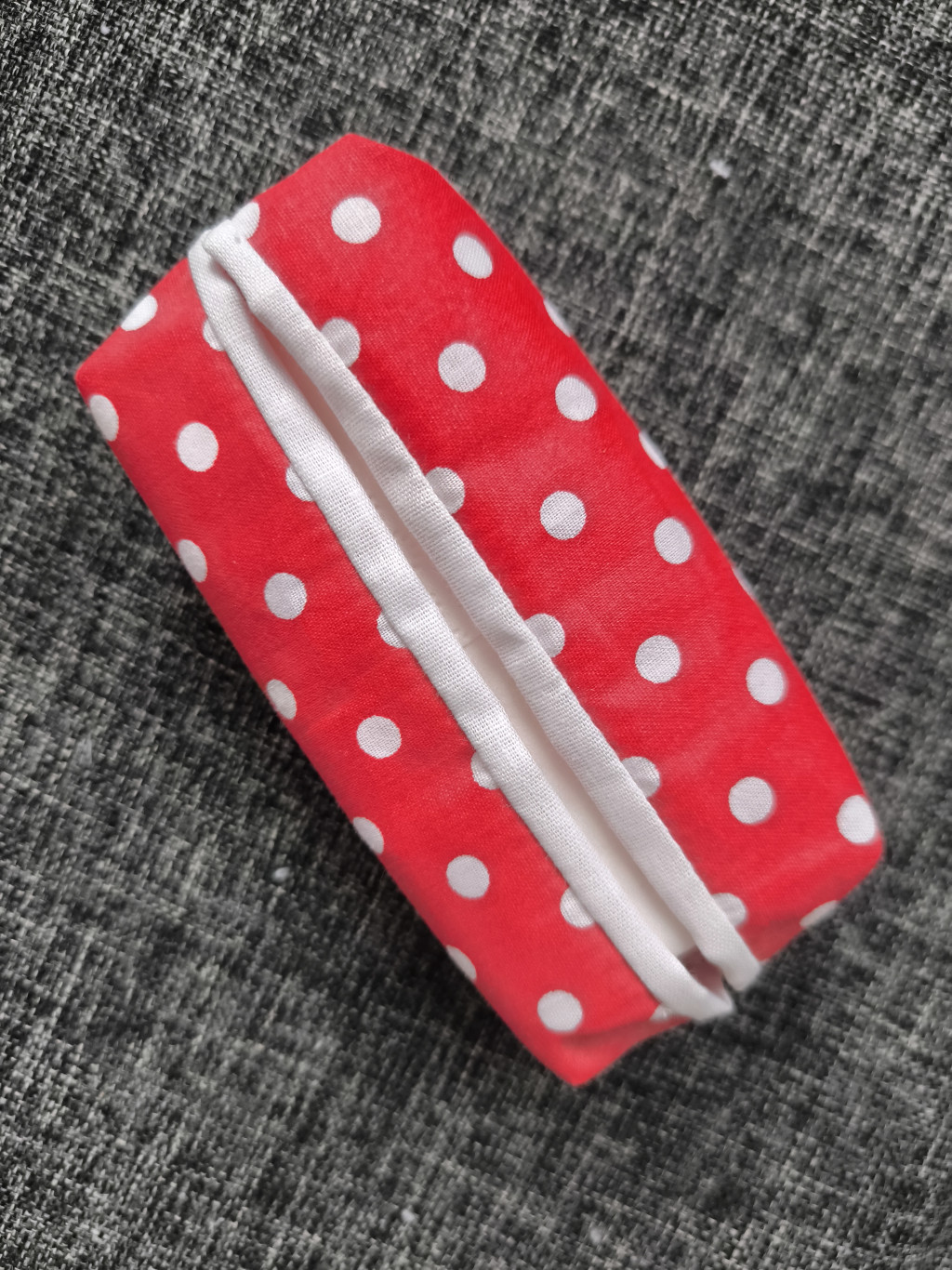 Pamutvászon anyagból készült, papírzsebkendő tartó. Piros alapon fehér pöttyös . Kézműves termék.