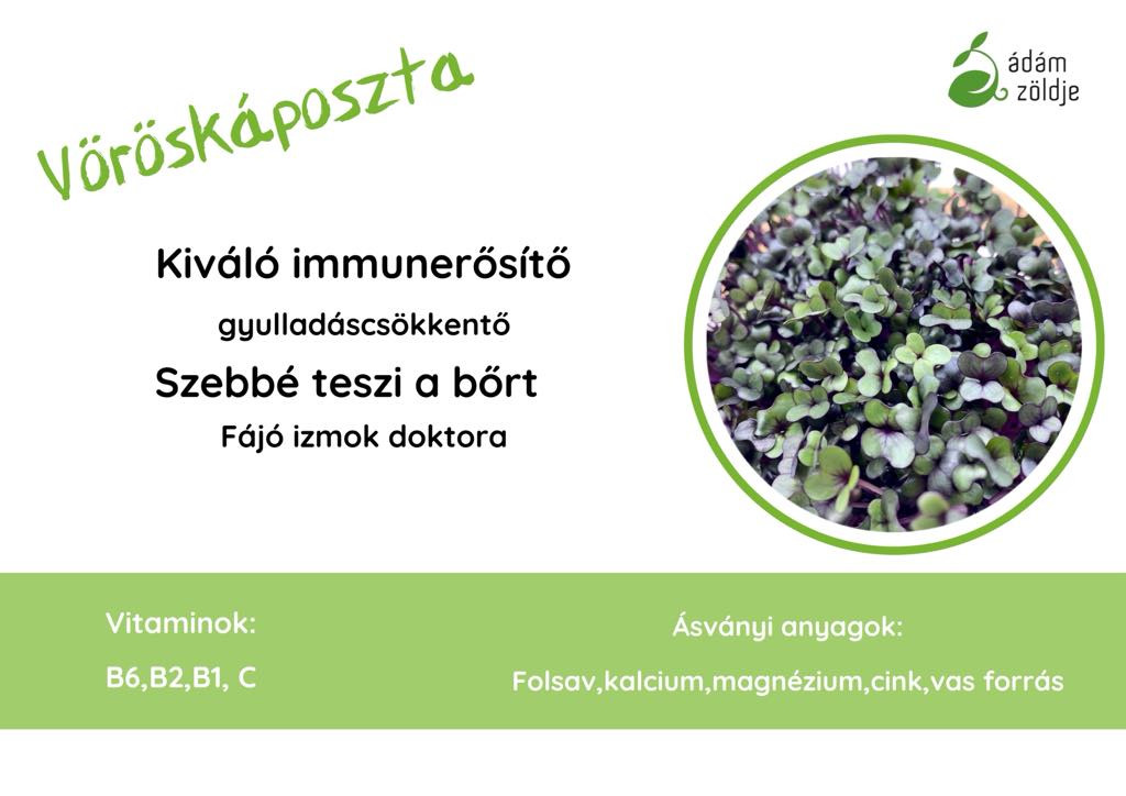 Vöröskáposzta mikrozöld   - kiváló immunerősítő - gyulladáscsökkentő -szebbé teszi a bőrt - fájó izmok "doktora"   Vitaminok: B6, B2, B1, C Ásványi anyagok: Folsav, kalcium, magnézium, vas, cink     Ha szeretnél többet megtudni mikrozöldjeinkről, látogass el honlapunkra: http://azmicrogreens.eu