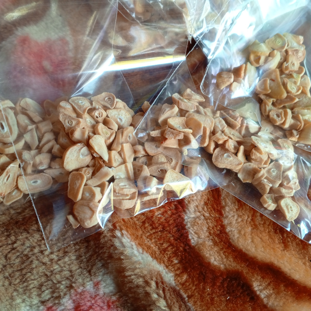 20 g. Felbontás után lègmentesen tárolandó pl dunsztos üvegben. Kb tízszeres mennyiségű fokhagymának felel meg. Bármibe tehető amibe friss fokhagyma,igény szerint regenerálva is lehet használni. Finom rágcsálni is ha èpp nincs jelenèsed valahol ahol illik jószagúnak lenni :D