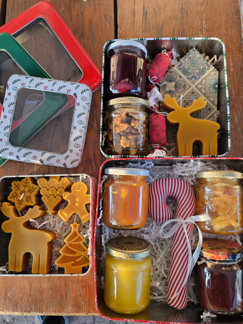 Saját termékekből összeállított csomagokat kínálunk,fém dobozban,mely a későbbiekben felhasználható. Remek gasztro ajándék. Piros doboz:2* 230 mles lekvár : sárgabarack és eper ízben, 2*25 dkg- os méz napraforgó és akácmézben ágyazott arany mazsola,1 db textil cukorbót - kézműves termék. Zöld doboz: 1 db méhviaszos kendő 25*25 cmes - eltérő mintával,1 rénszarvasos gyertya,2 db textil szaloncukor - kézműves termék,1 db 220 ml- es vegyes bogyós lekvár,1 db 25 dkg- os akácméz dióval. Fehér mintás doboz tartalma egy karácsonyi mintás gyertya csomag , méhviaszból öntve.