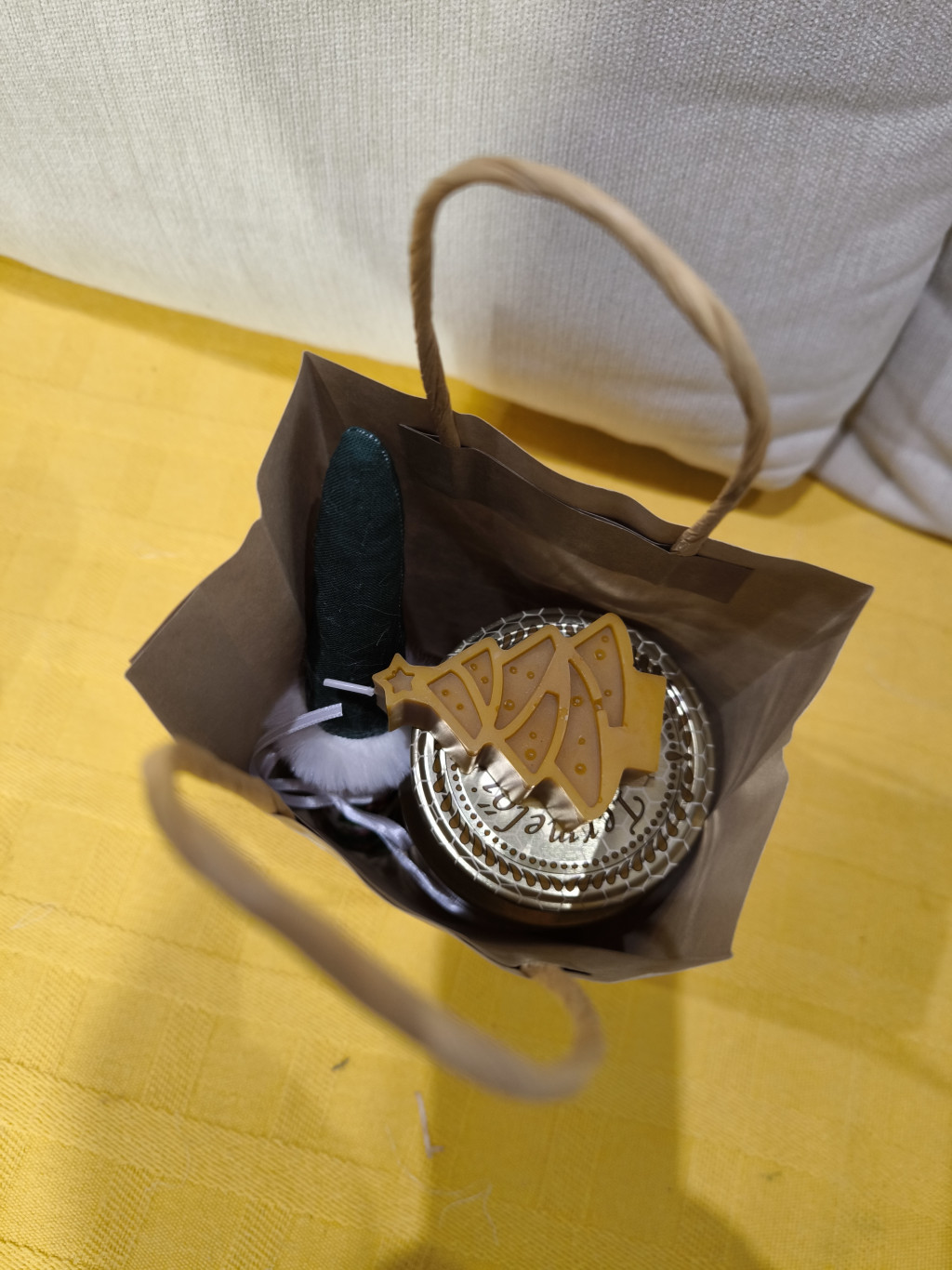 Méheink által gyűjtött 1 kg-os mézet,karácsonyfa alakú méhviasz gyertyát és egy kedves kis kézműves manót tartalmaz minden papír táska.a manó ,a gyertya és a táska mintája eltérő .Így együtt egy aranyos figyelmesség.