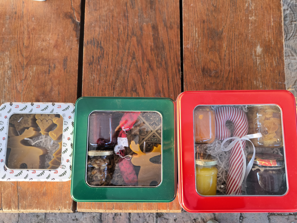 Zöld doboz: 1 db méhviaszos kendő 25*25 cmes - eltérő mintával,1 rénszarvasos gyertya,2 db textil szaloncukor - kézműves termék,1 db 220 ml- es vegyes bogyós lekvár,1 db 25 dkg- os akácméz dióval.