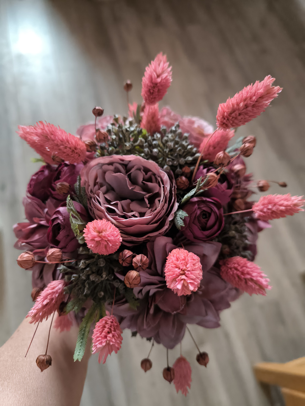 Egyedi, kézműves termék. Élethű művuragot és szárított növényt tartalmaz. A dísz kb 20*25 cmes.