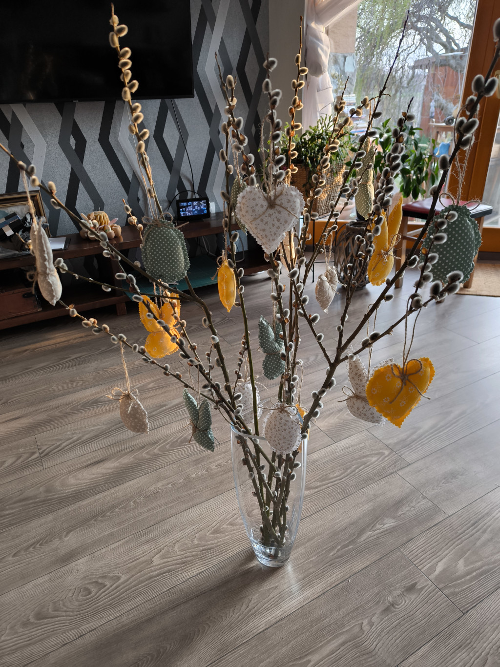 Kézműves termék, pamutvászon anyagból készült. A tavaszi, húsvéti dekorációk kellemes kiegészítői lehetnek. Mérete 8,5*14,5 cm.