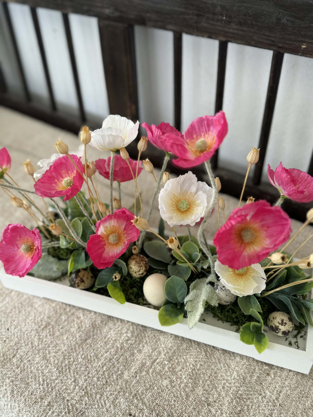 Vidám tavaszi dekoráció. Pipacs mező ihlette asztaldísz. Tökéletes ajándék is lehet. Hosszúsága: 45cm