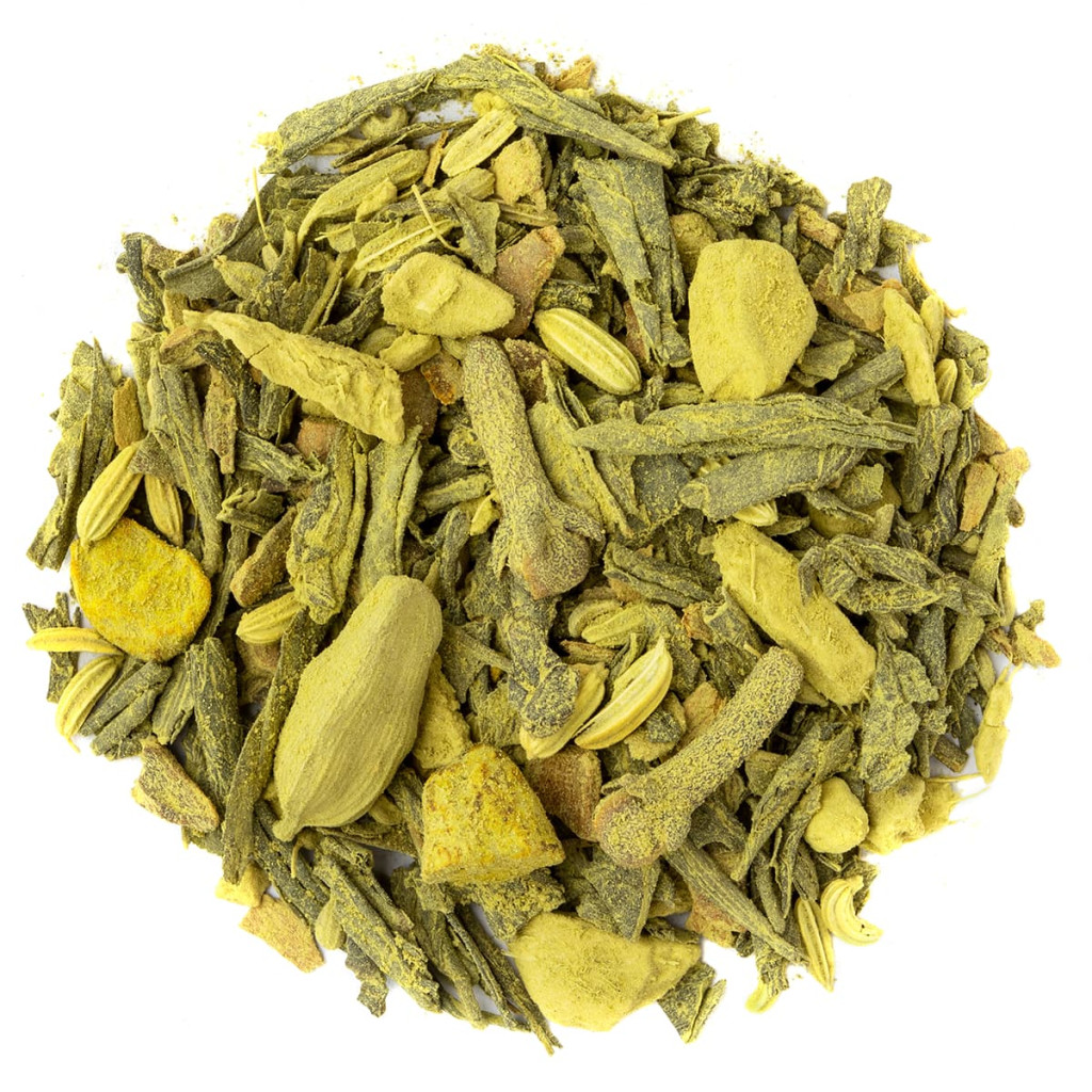 Fűszeres matcha chai  Ez a fűszeres zöld tea a sencha frissességét és a matcha élénkítő mélységét ötvözi a meleg, keleties fűszerekkel. A gyömbér, a fahéj és a kurkuma karakteres jegyeit az ánizs és a kardamom aromás fűszeressége kerekíti, harmonikus, energizáló ízvilágot teremtve. Összetétel: kínai sencha zöld tea*, gyömbér*, fahéjrúd*, ánizs*, édeskömény*, ceyloni fahéj*, kurkuma*, matcha zöld tea*, kardamom*, szegfűszeg*, őrölt kardamom*. * 100% ellenőrzött ökológiai gazdálkodásból. Származás: EU és nem-EU országok. Ízjegyek: fűszeres, élénk, zöld Nagyon szeretjük jeges matchai latteként egy citromos süti társaságában.