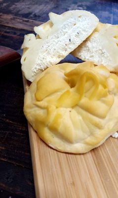 Porta Batyu (füstölt burrata) Kecske- és tehéntej keverékéből készült gyúrt sajt, melyet lágy krémsajtal töltünk meg és bükkfával füstölünk. Vásárlóink nagy kedvence.