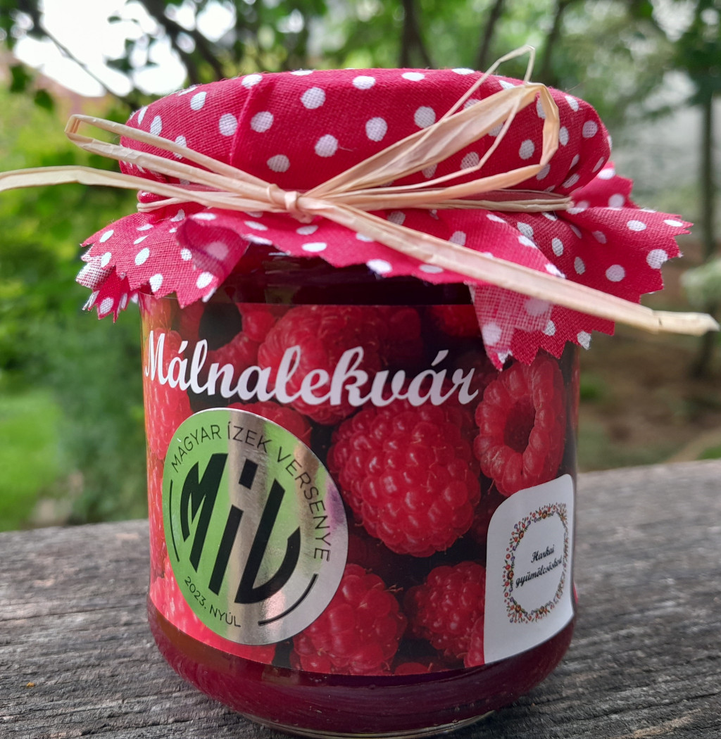 Házi málnalekvár magok nélkül. A Magyar Ízek Versenyén ezüst fokozattal díjazott termék. Összetevők: málna (min. 68%), cukor, citromsav.