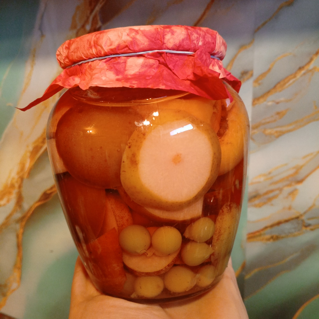 Vegyszermentes gyümölcsökbőlVegyes gyümölcs kompót: körte, szilva, paraszt barack, szőlő vegyesen. 720 ml üvegben.